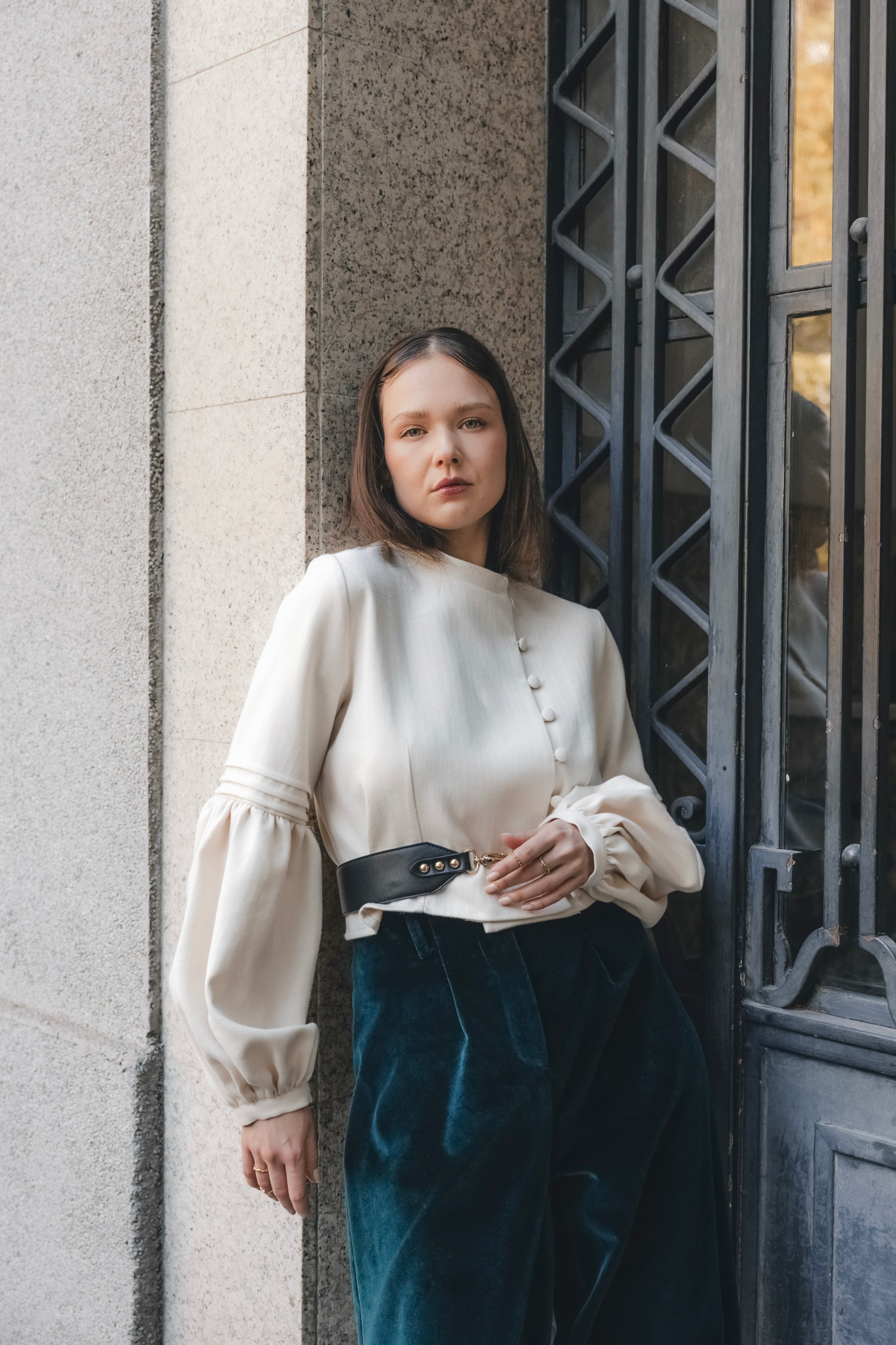 Inspirada en las chaquetas de 1980, reinterpretada en una blusa contemporánea. Con mangas voluminosas, botones forrados y cuello alto tipo mao. Las mangas voluminosas y predominantes eran imprescindibles en las blusas de la época. El tejido es suave pero aporta estructura convirtiéndolaen un must para un look clásico. Confeccionada en 100% algodón.