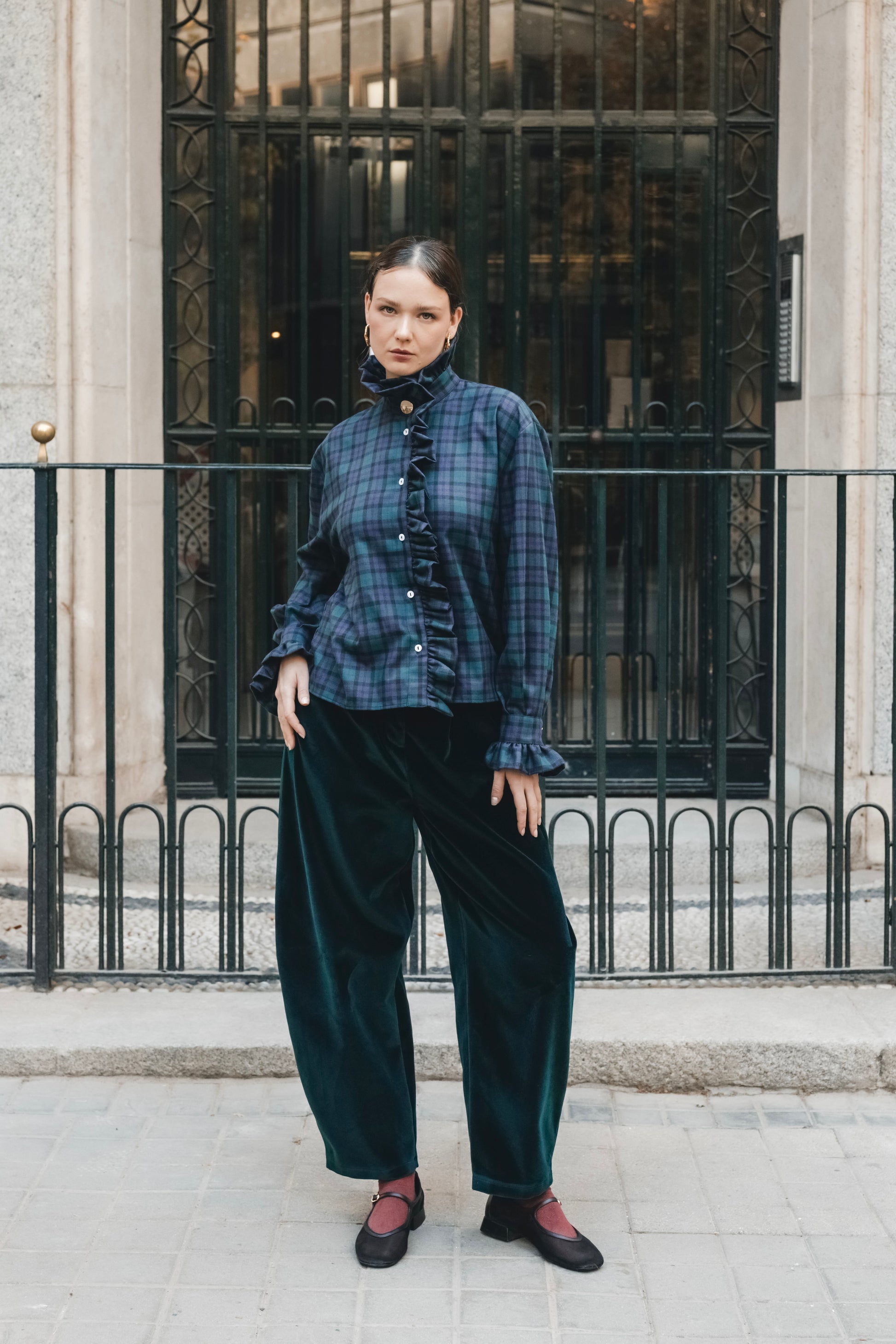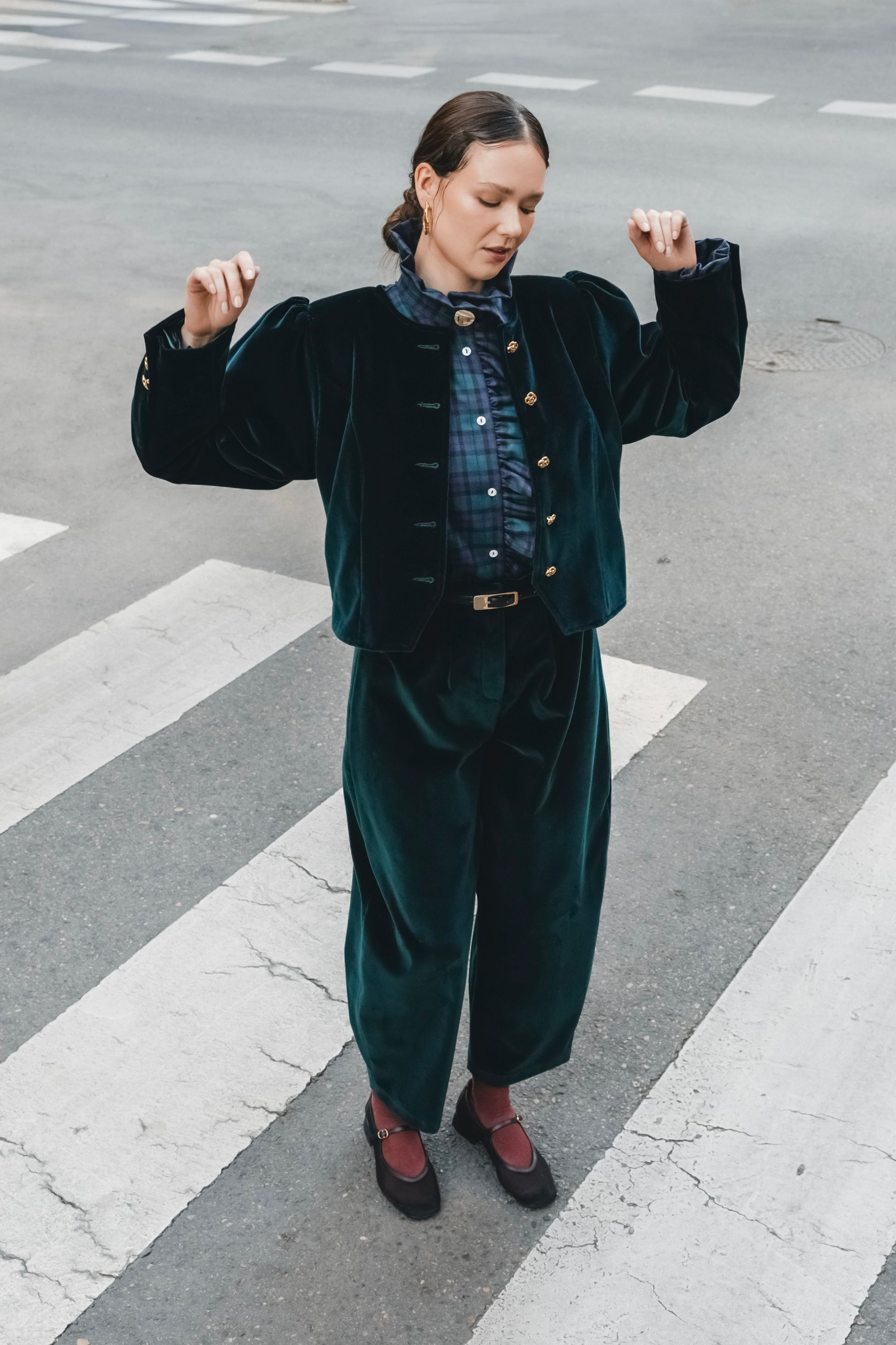 Un homenaje al volumen de los años 80. El Pantalón Vivienne reinterpreta esa esencia rebelde con una silueta globo, suaves pinzas y talle alto que enmarca la figura con dramatismo. Confeccionado en un terciopelo 100% algodón en verde inglés.
